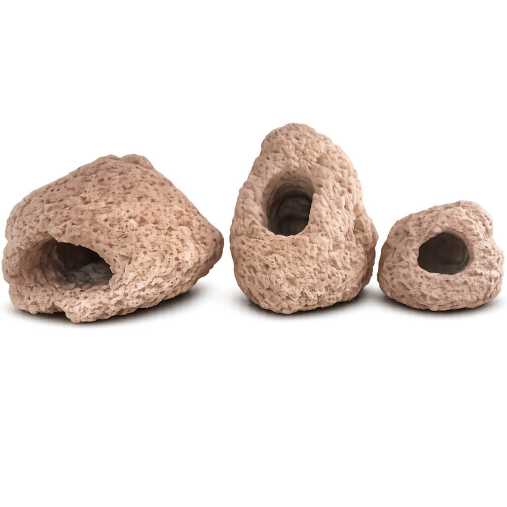 Talladas en piedra pómez natural, estas cuevas ofrecen un escondite seguro y estético para tus peces.