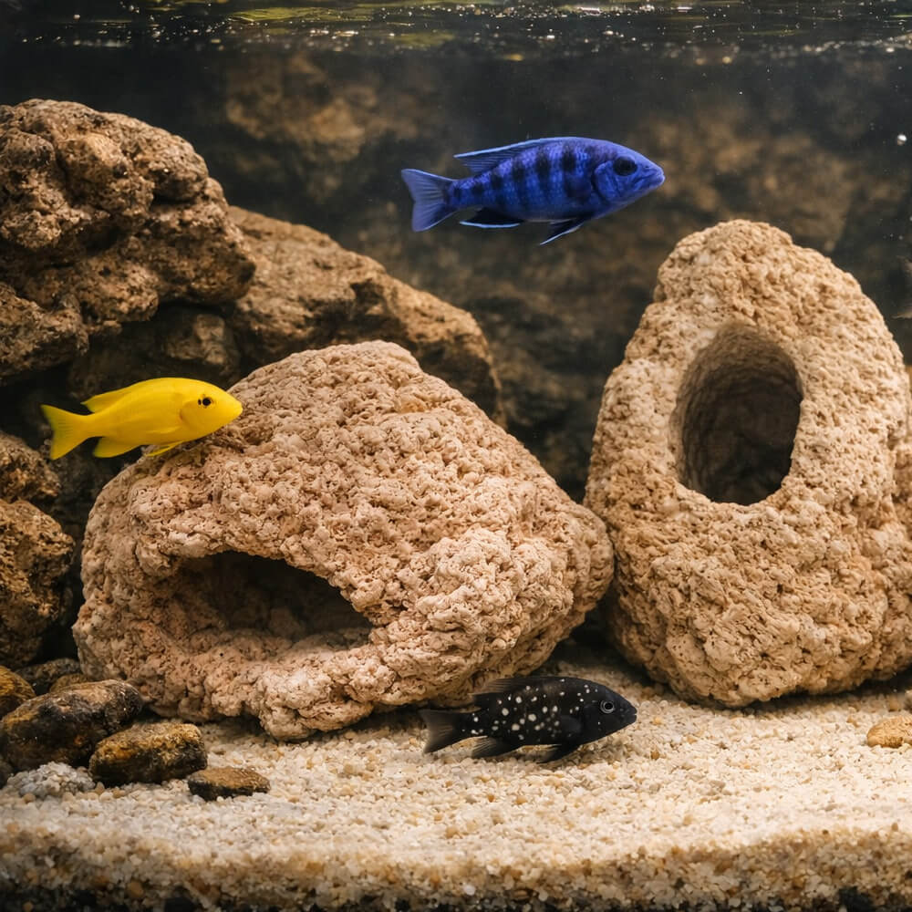 Su textura porosa y sus formas irregulares las convierten en el refugio ideal para cíclidos, favoreciendo su bienestar y comportamiento natural